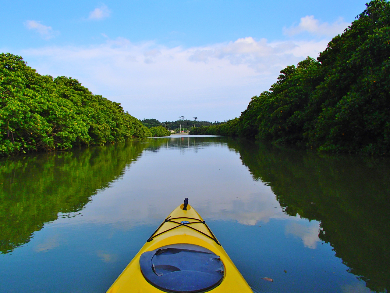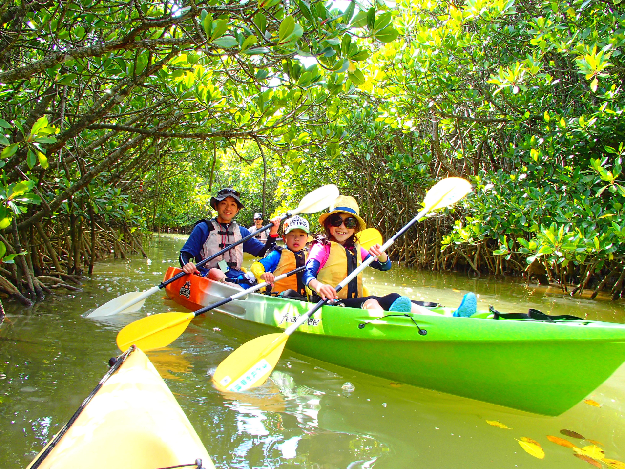慶佐次のカヌーツアー発祥。天然記念物のマングローブ広がる国立公園でカヌーを堪能。3歳のお子様から参加できる体験です。