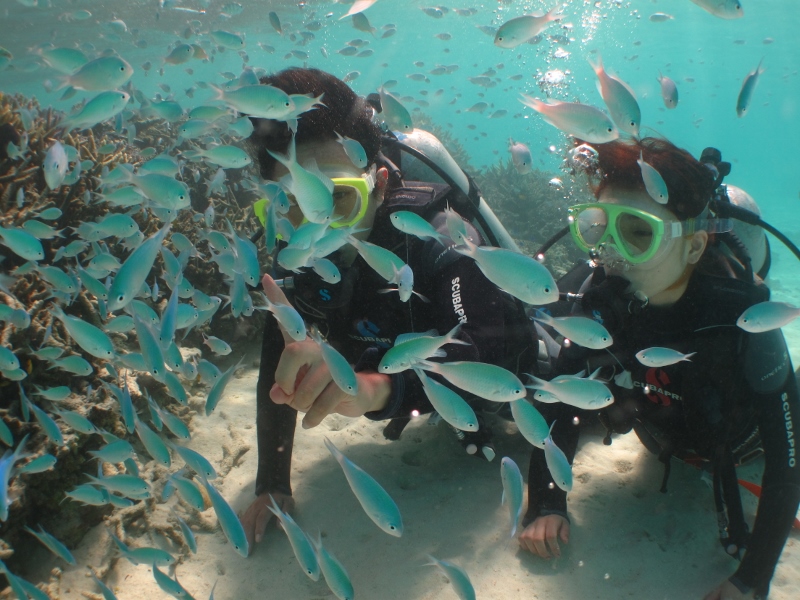 私たちは全員がダイビング初体験でしたが、船内で丁寧にレクチャーを受け、入水後もスタッフの方々が付きっきりでサポートしていただいたので安心してダイビングが楽しめました。