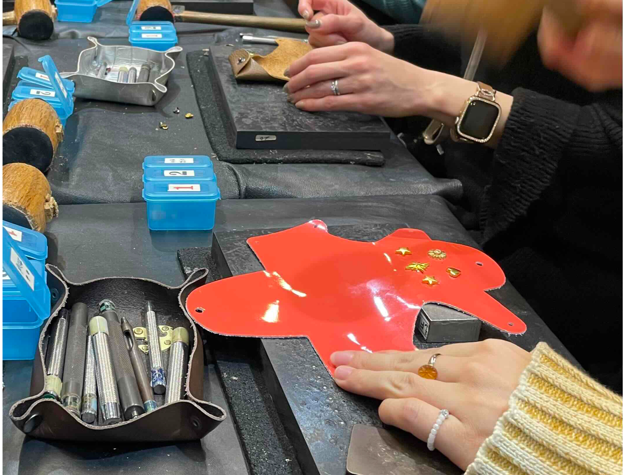 新店でも数十種類からなるレザー体験をご用意しております。作るのも簡単 折り紙のように折ってかしめて出来上がり!