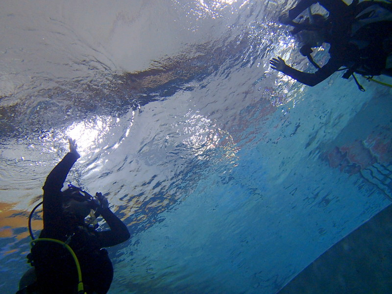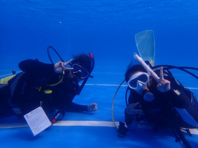 このコースは水深5mのダイビングプールで、練習を行います。波風もないプールなので、ゆっくりと安心して行えます。
