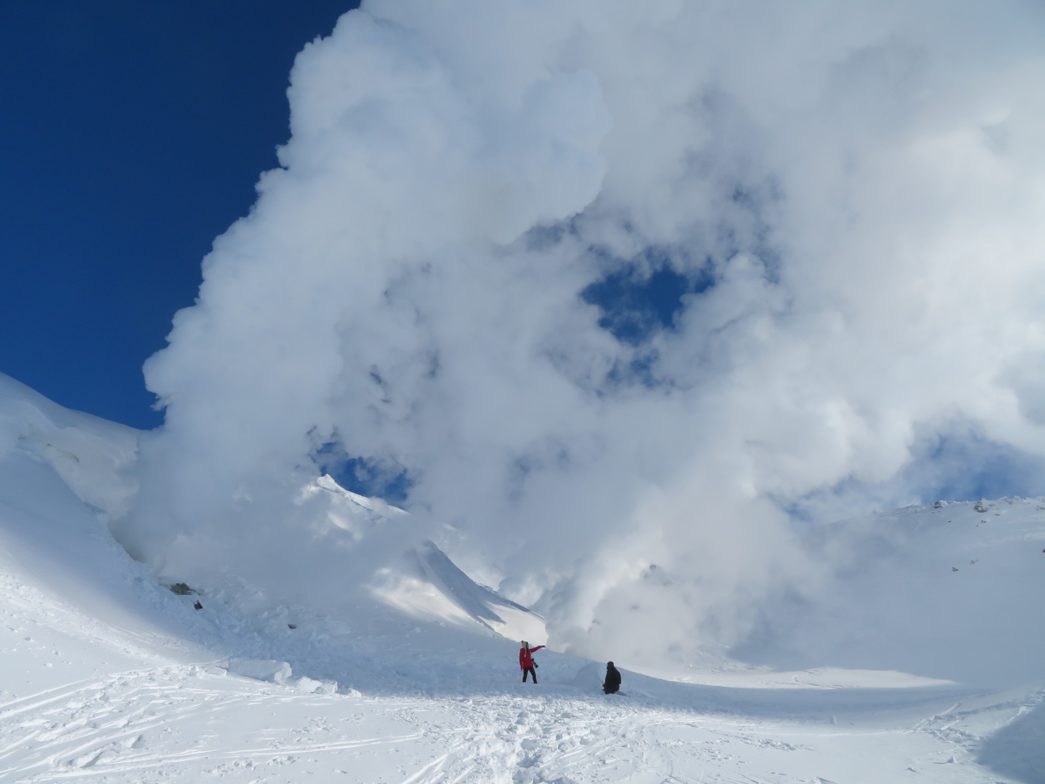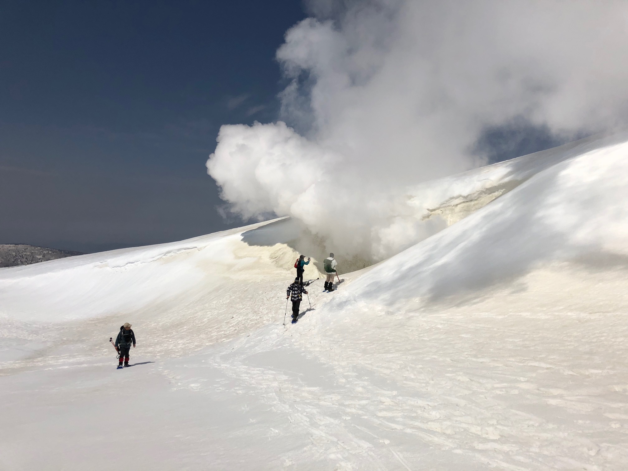 水蒸気を上げる噴気孔。活火山旭岳を感じさせる光景です。
