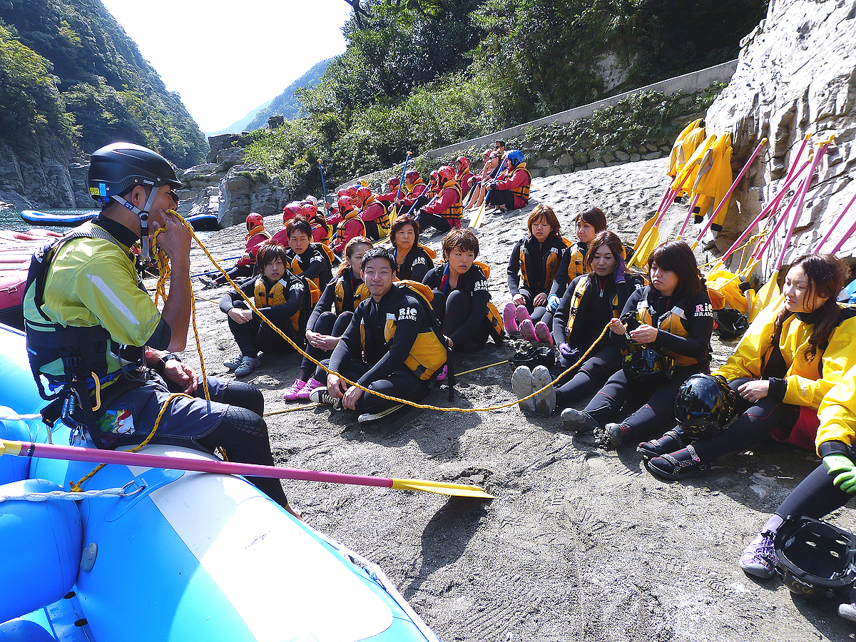 川に到着したら安全の説明を行います。レスキューの方法や落水時の対応など、楽しくツアーを行うために丁寧に説明していきますので、初めての方もご安心ください。