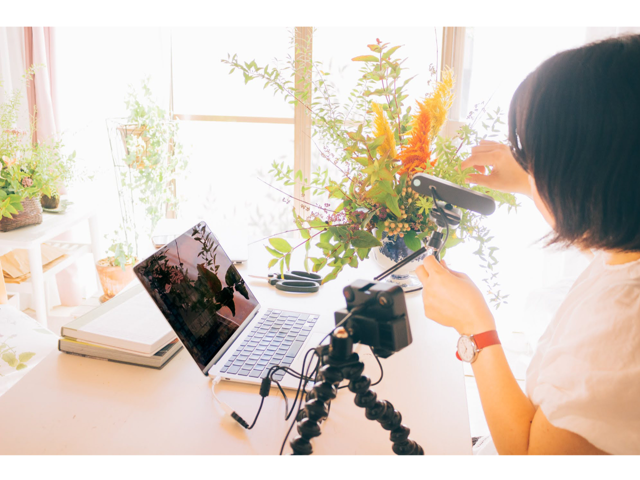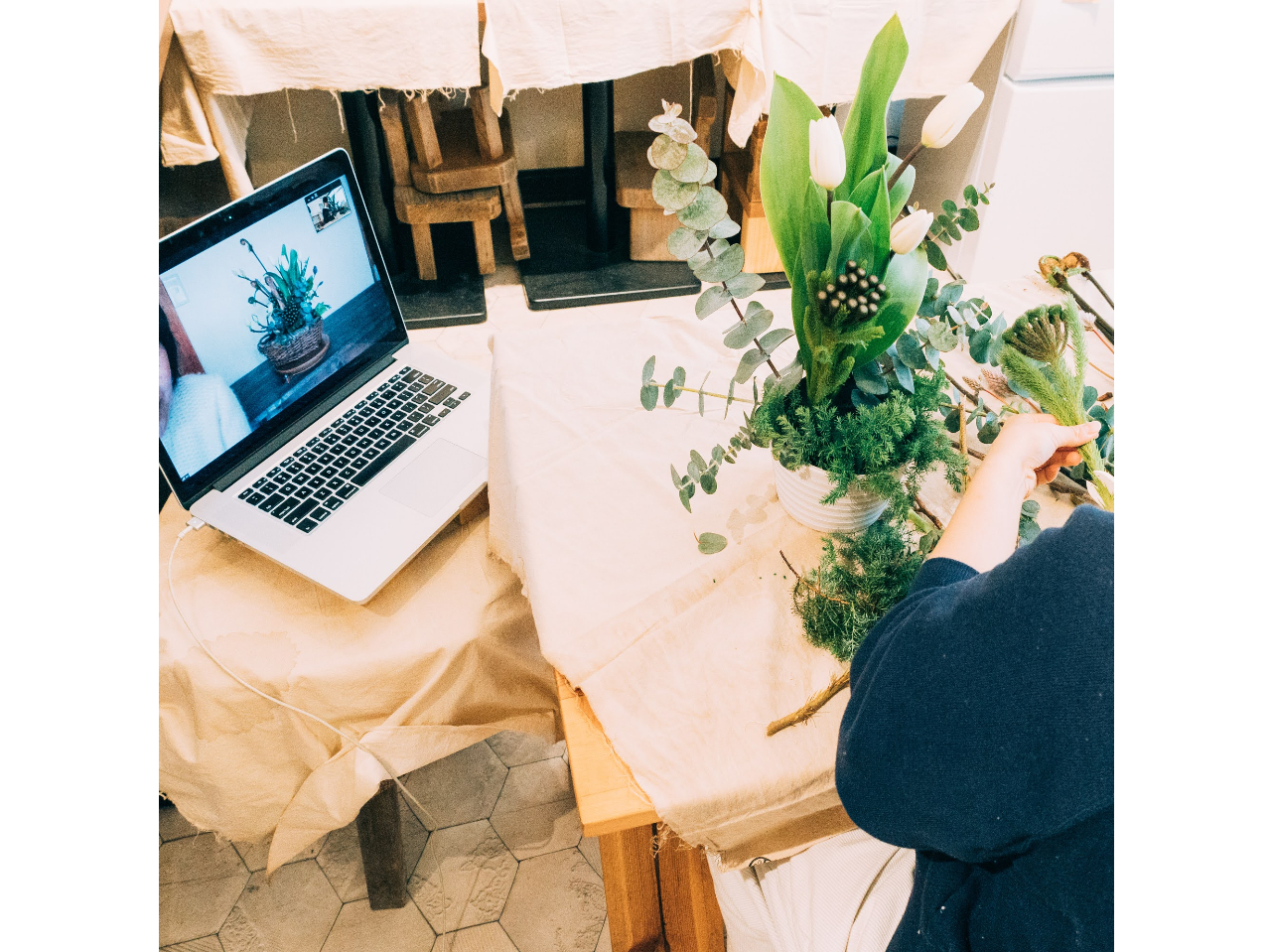オンラインでフラワーアレンジメントレッスン♪カメラで細かいところを映しながら、そしていろんな角度から見ていただきながらレッスンを進めます。
