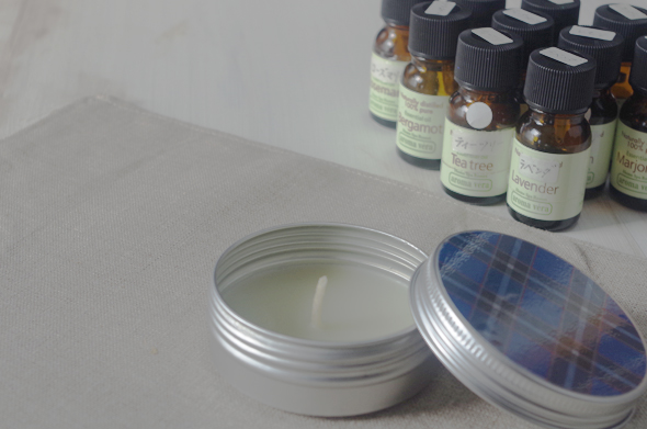 さらに、好きな香りのエッセンシャルオイルを数滴入れ、最後に芯を入れれば完成!神戸タータン柄パッケージも素敵!キャンドル作り(アロマキャンドル等)
