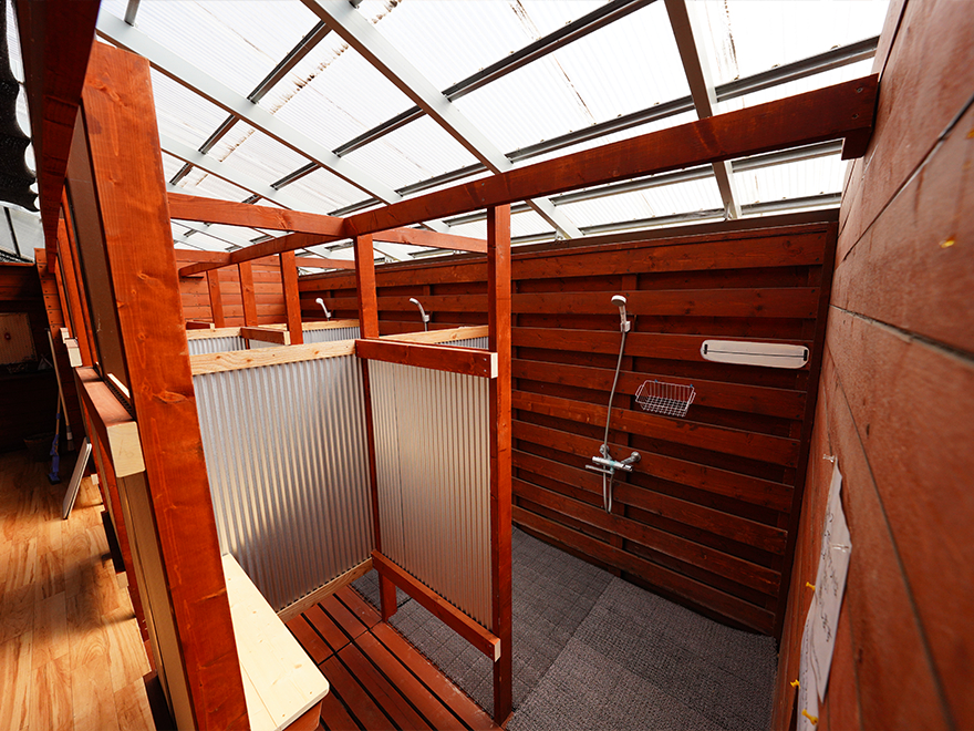 お隣との仕切りがあるシャワーブースが男女3基ずつあります。