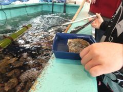 常時500個の生きてるあこや貝の水槽から、お好きな一つを選んでいただきます、どんな珠が出てくるかワクワク、ドキドキお子様にも大変喜ばれています。