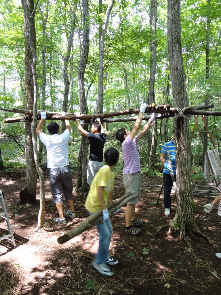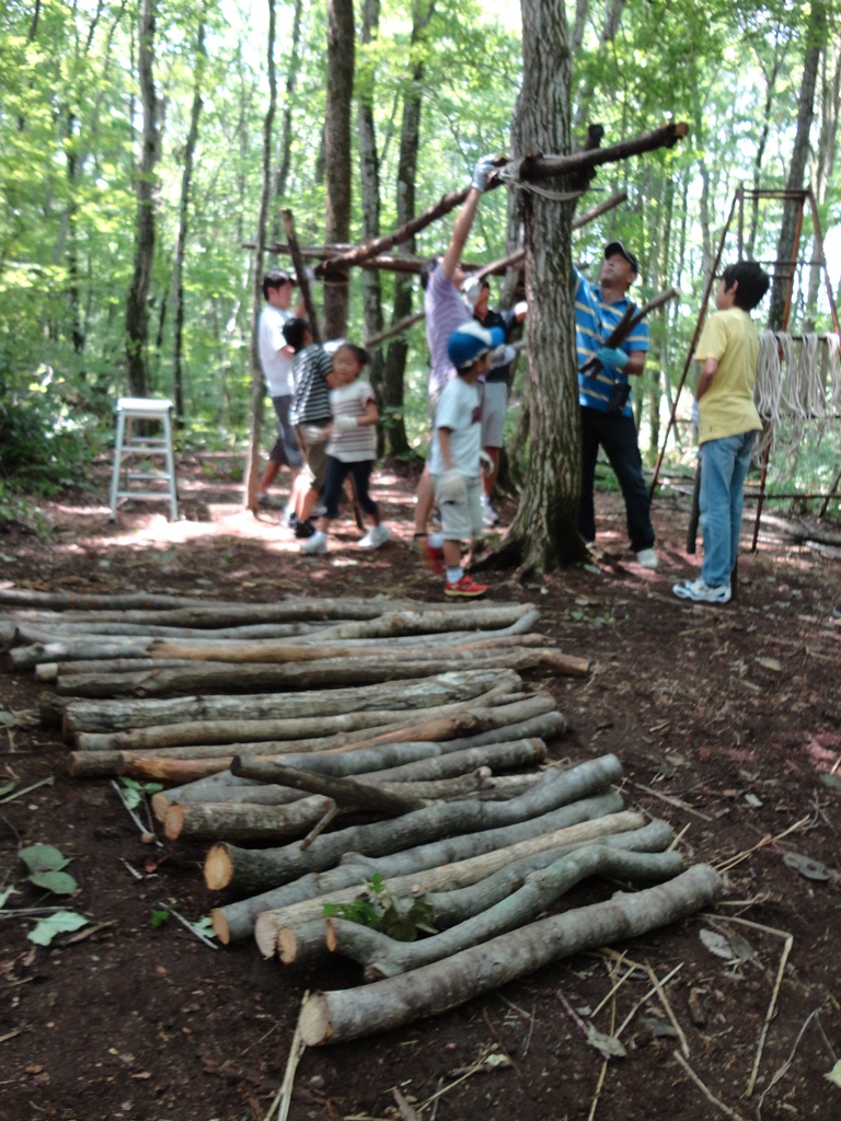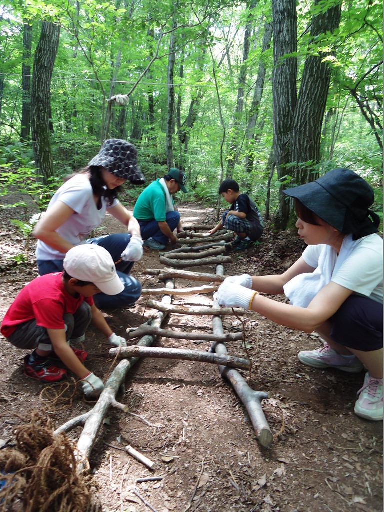 ノコギリやロープを使って、材料集めや組み立てなど親子でみんなで取り組む森の自然体験。