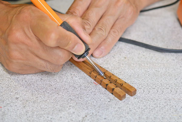 四角の細長い棒を紙ヤスリでゴシゴシ、箸先が細くなるように注意しながら削っていきます。粗めのヤスリで形を整え、細かいヤスリでスベスベ感を出し、仕上げに蜜ろうを塗って出来上がり。ちょっと焼きごての模様が不揃いですが、マイ箸に満足しました。