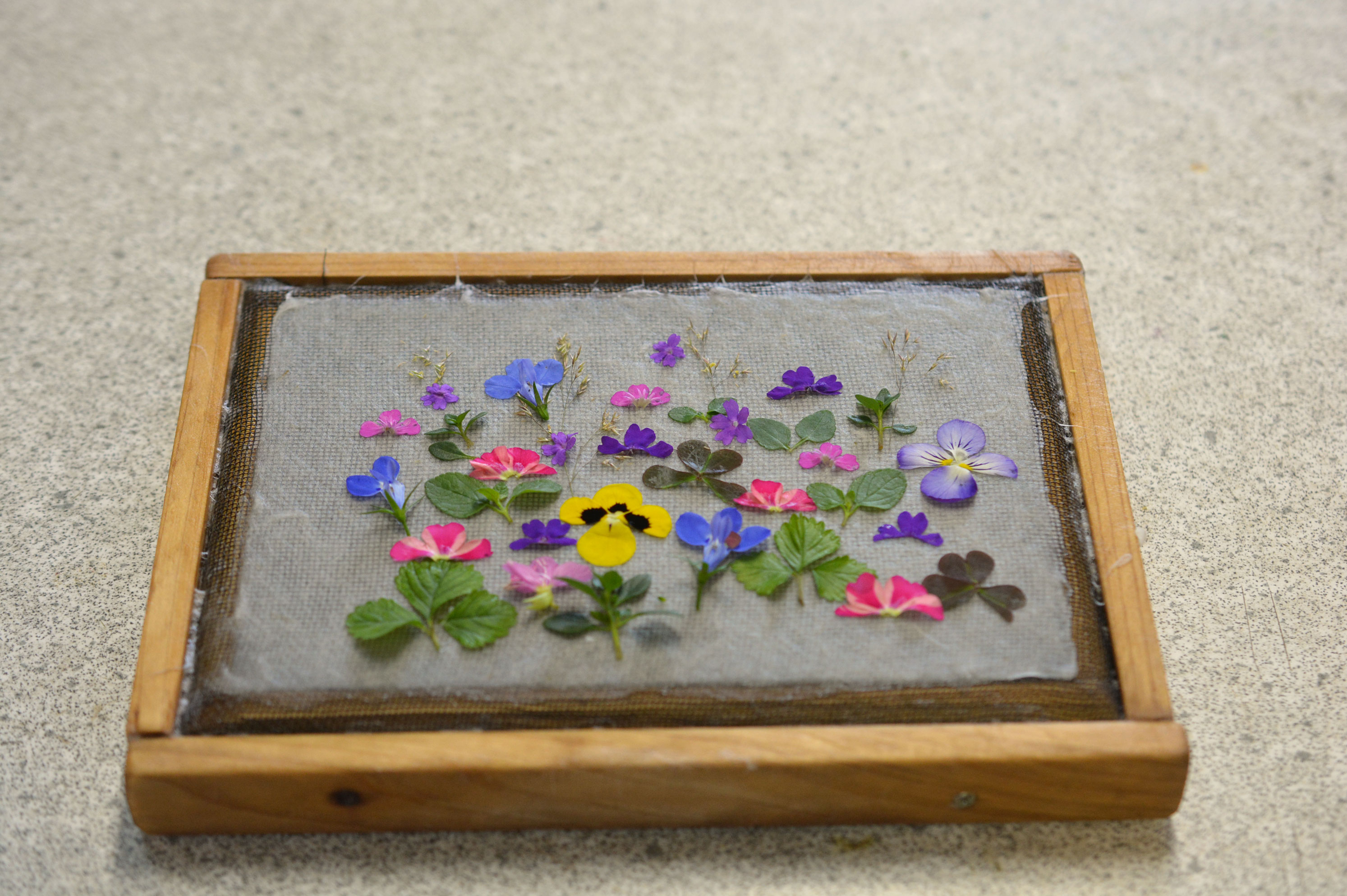 自分で摘んだ草花を漉いた和紙の上にアレンジします