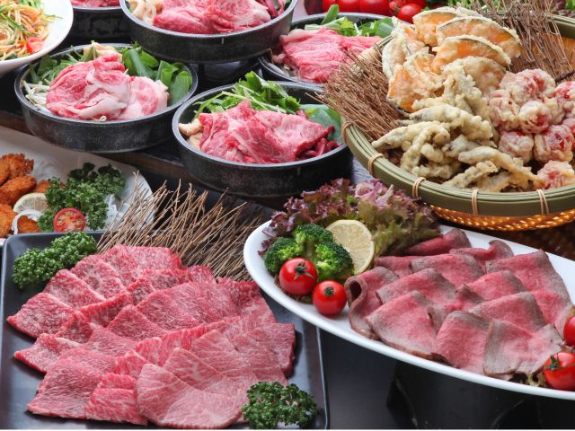 「すき焼き」「しゃぶしゃぶ」「ローストビーフ」。そして、ライブキッチンでは職人が焼き上げる『近江牛ステーキ』は特製ソースや岩塩、山葵などのトッピングでお召し上がりください。
