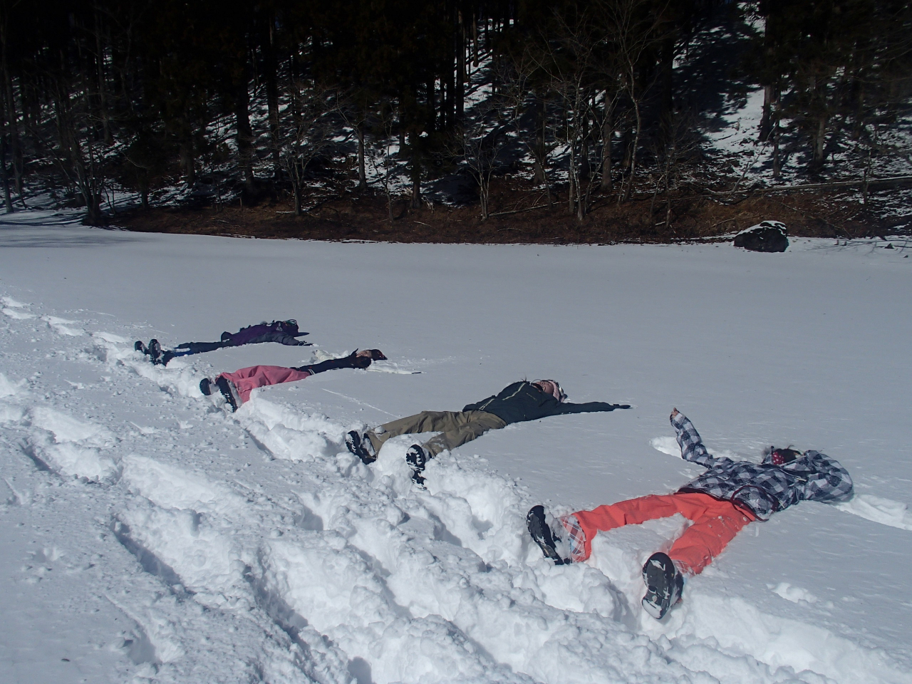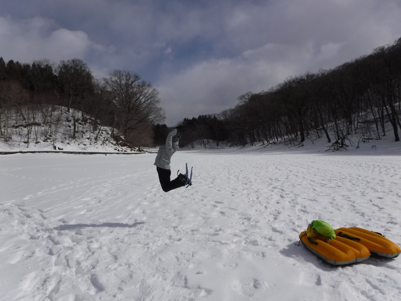凍りついた沼の上をスノーシューを履いてワクワクドキドキスノートレッキング。