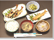 オプションで炭火で焼かれたアユが付く「ひのきや」特製アユ定食をご用意いたします。那珂川の絶景を見ながらゆっくり楽しんでください