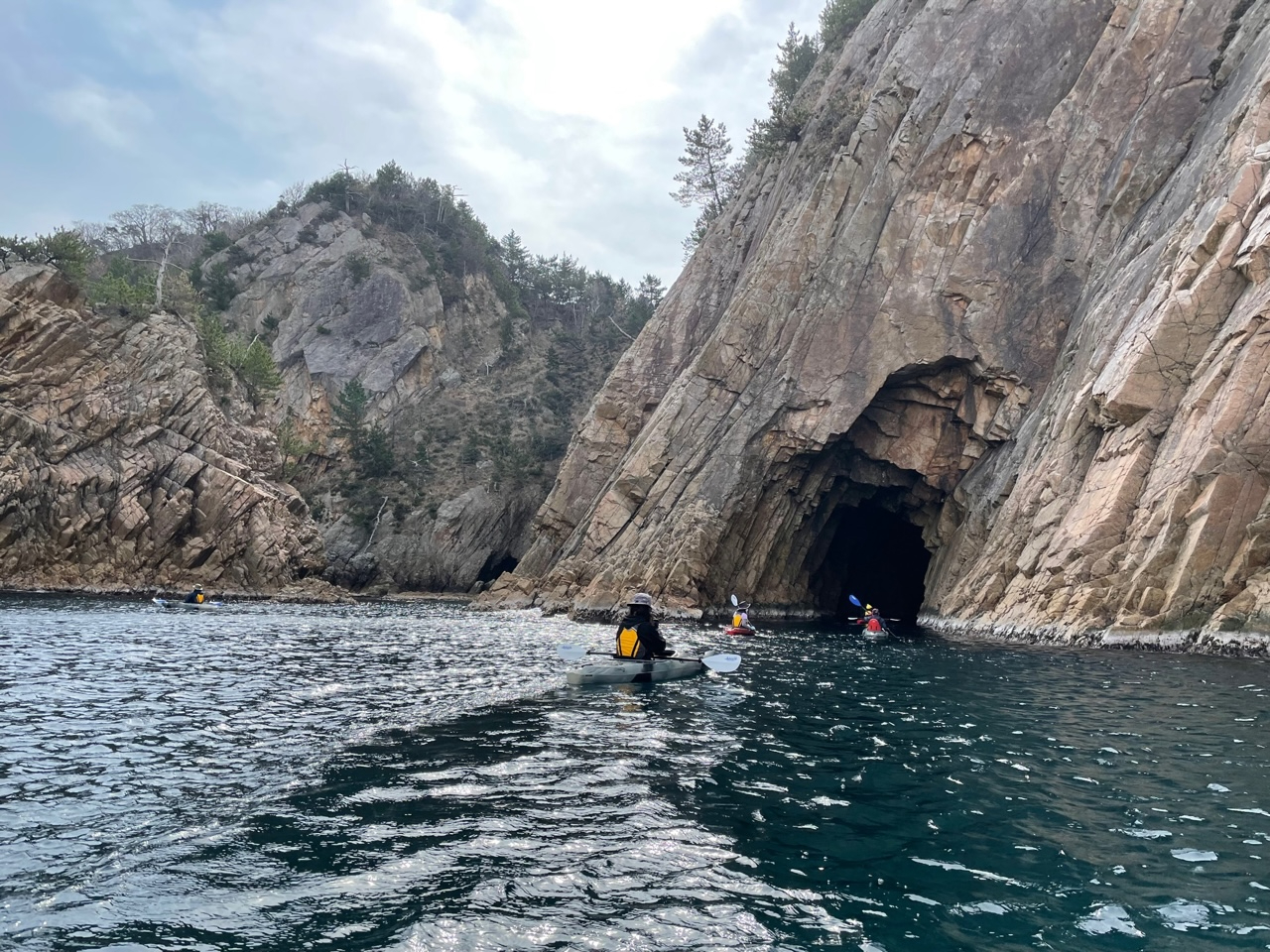 このツアーはロングコースで概ね12キロの海岸線を洞門、洞窟に入りながら走破する経験者向けアドベンチャーカヤック体験です。