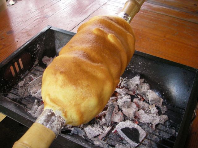メレンゲから泡立て、竹の棒に一層一層焼いていきます。
