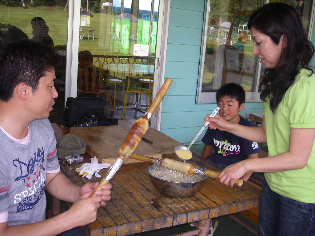 メレンゲから泡立て、竹の棒に一層一層焼いていきます。