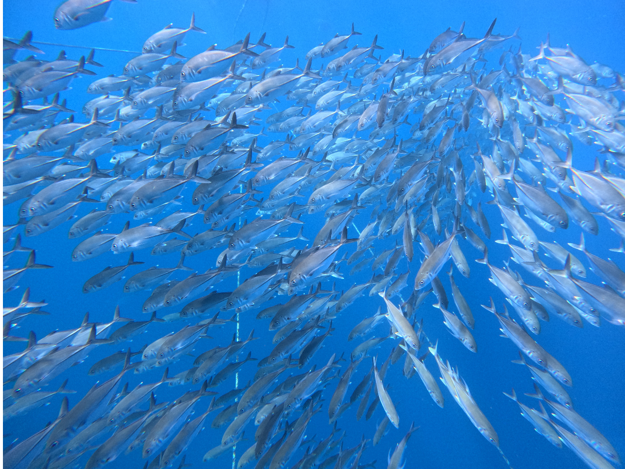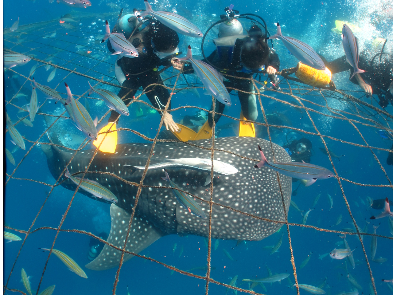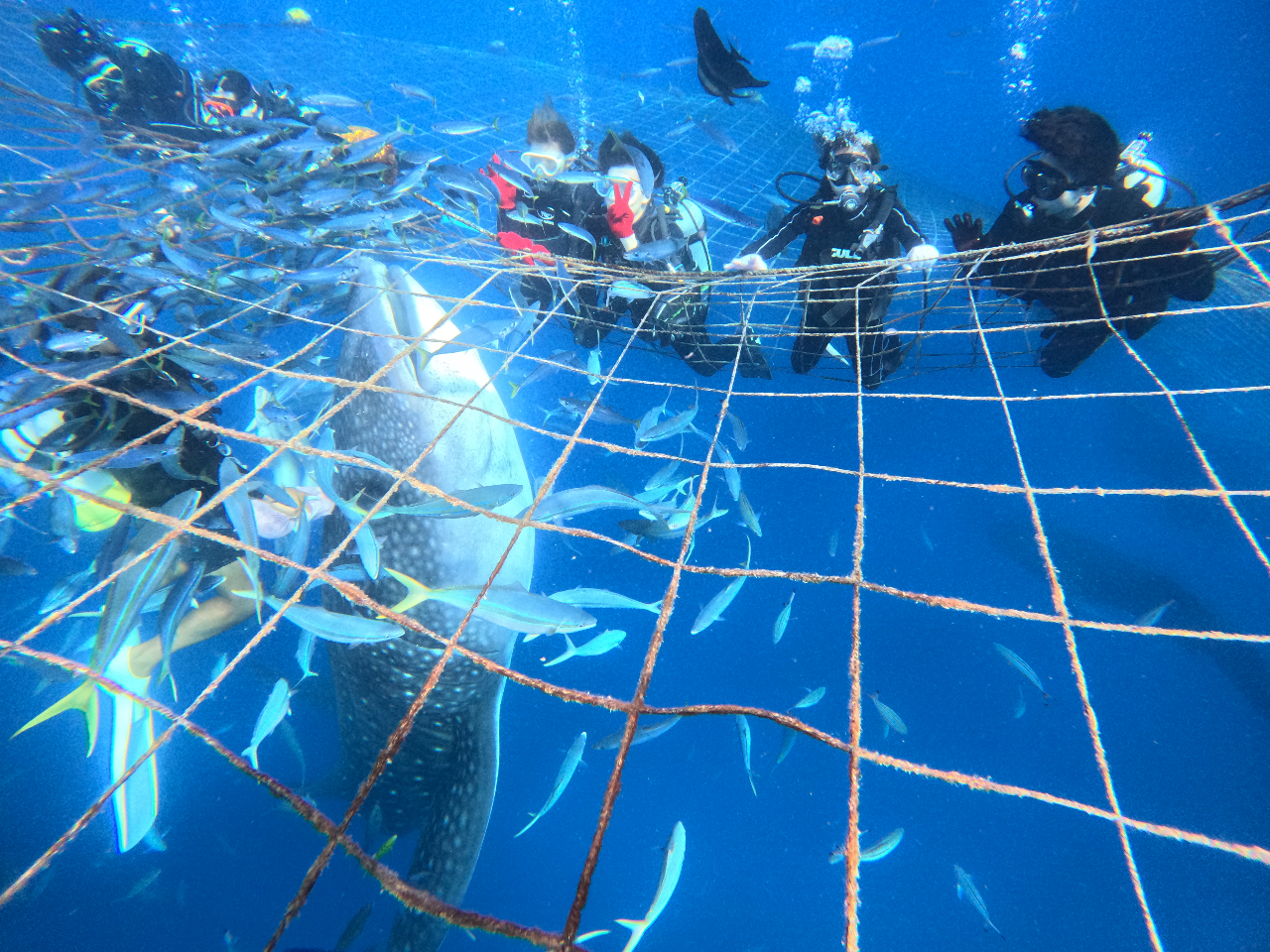 ・2023年よりジンベイザメのストレス軽減のため、ファンダイビングも網の外からジンベイザメを見る感じになります。それでも手が届きそうな距離でジンベイザメを見ることが出来たりここ数年、網の周りにギンガメアジの群れがいたりすることがあるのでファンダビングではその群れを見に行ったりできます