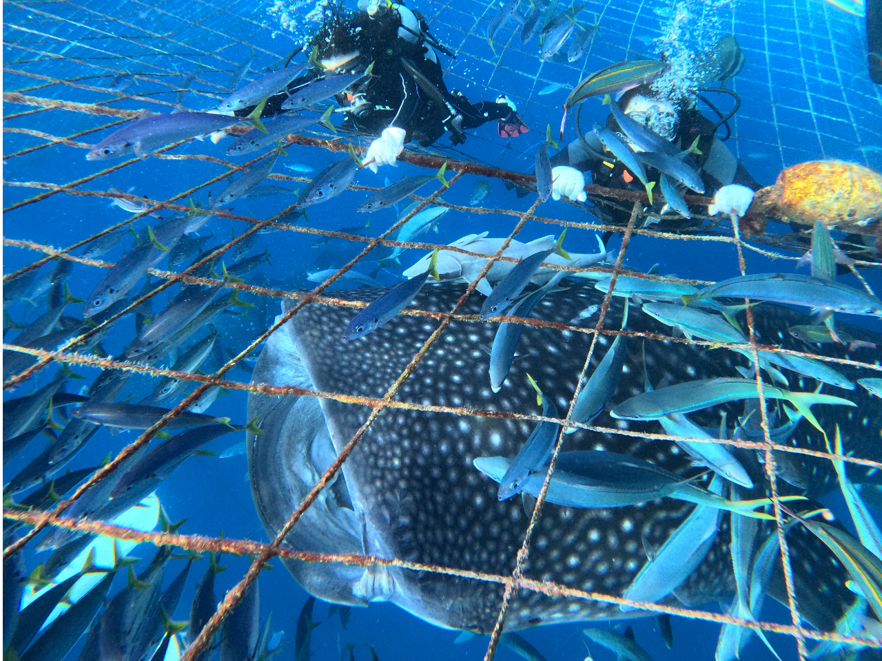 ・ 都屋漁港(読谷村)沖合いに全長約20m超の網が張られておりその中でジンベイザメが飼育されております。2025年現在、体長6mと5mのジンベエザメが2頭!!その大きさに感動すること間違いなし!!
