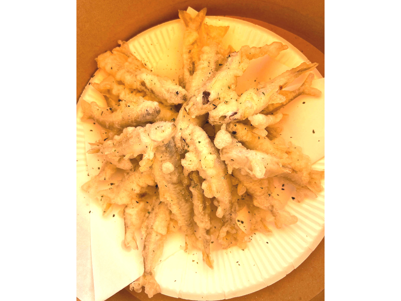 釣ったワカサギをその場で天ぷらにし試食。甘みがありサクサクで美味しいですよ。釣れなかった場合でも事前にガイドが釣ったワカサギを数匹提供します!