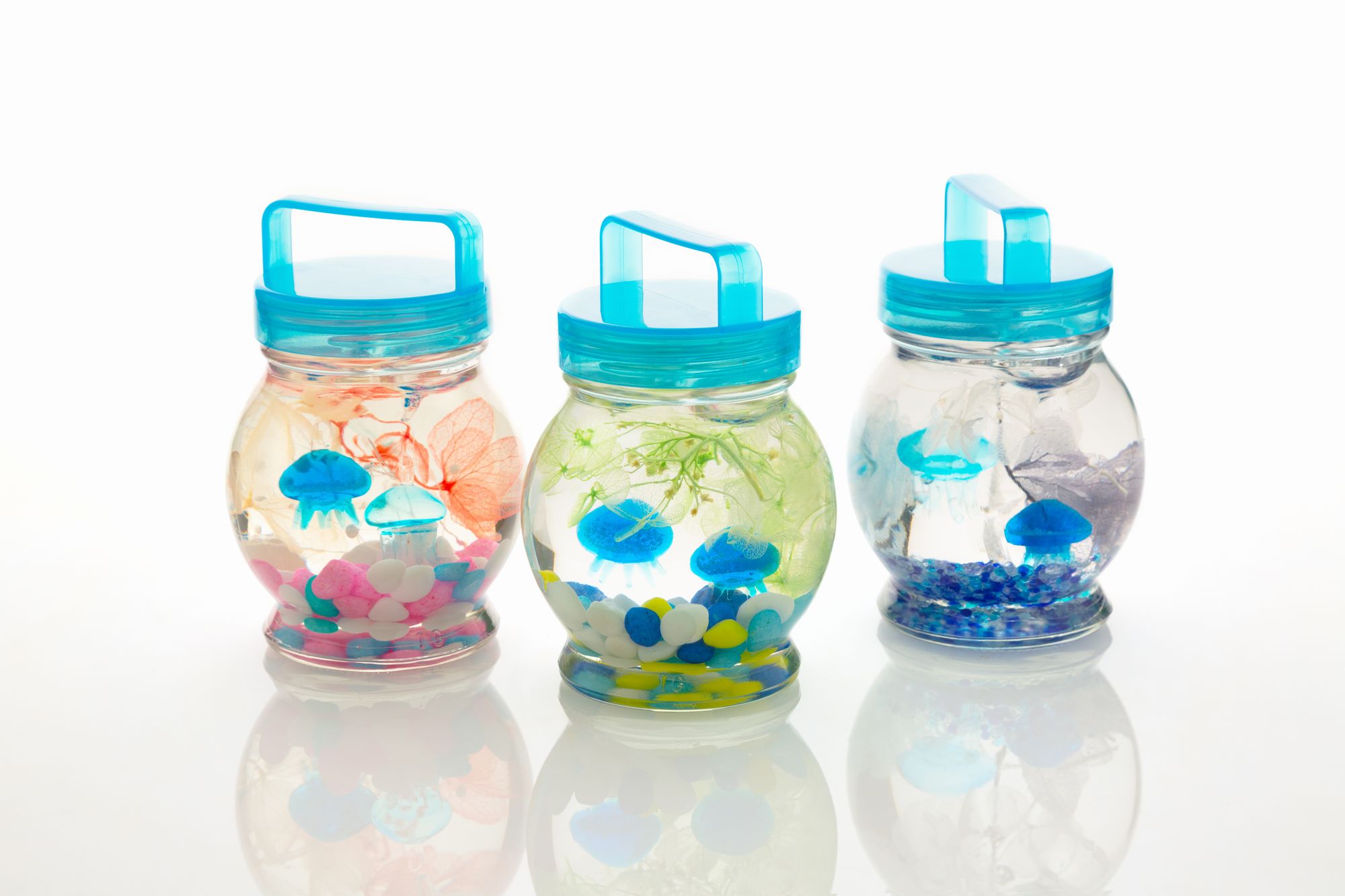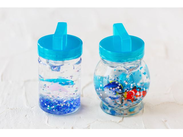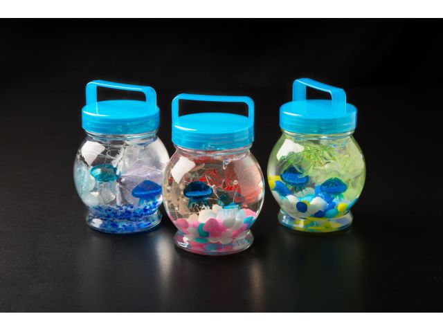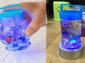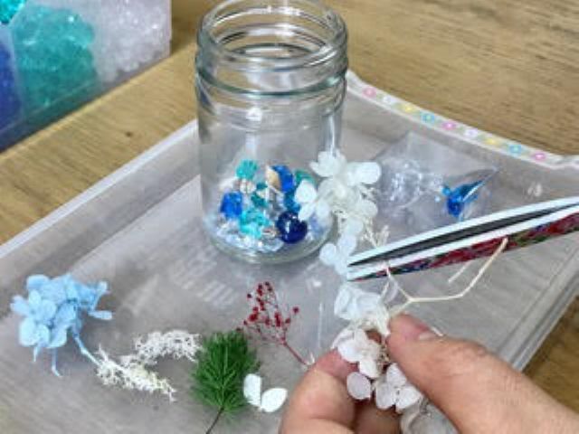 かわいいクラゲやお魚がぷかぷかただよう楽しいハーバリウム作り体験です。LEDライト付き