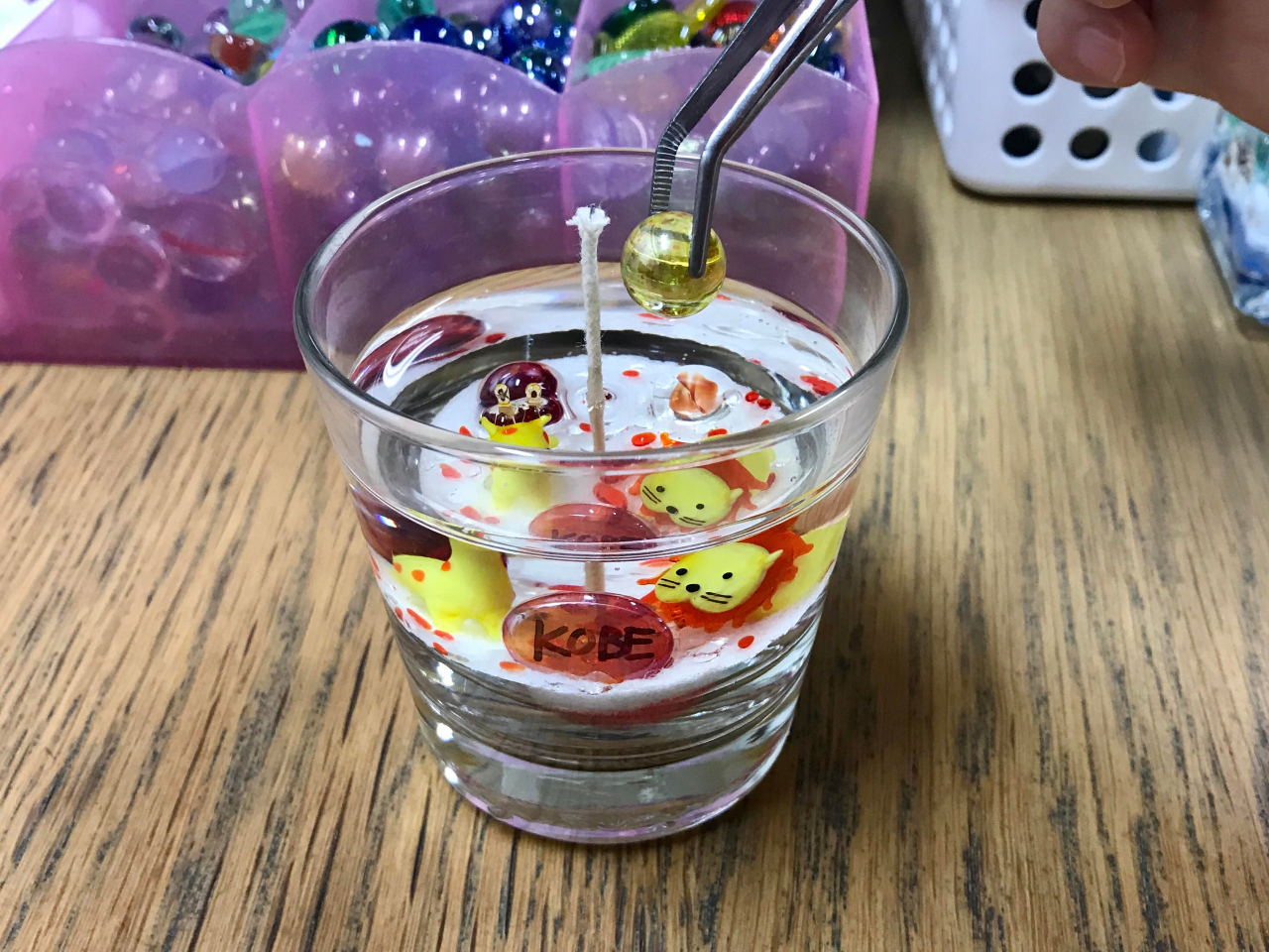 E グラスを揺らして固まったか確認します。固まったら、水から上げて次の工程に入ります。キャンドルの上部にビー玉やガラス細工等を浮かせて入れることができます。