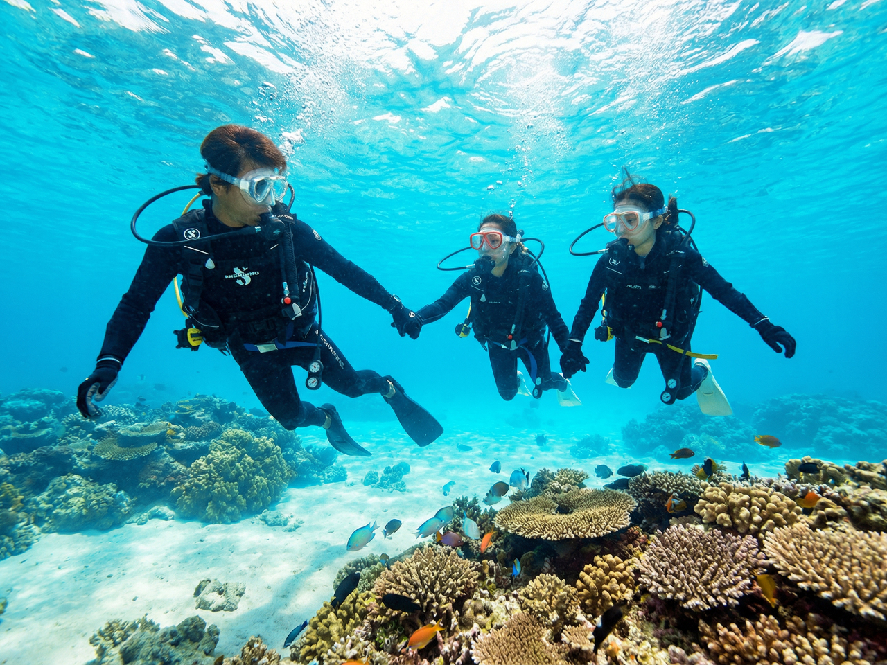 ・ヘルメットをかぶって、水底を散歩しながらダイビングを楽しめます