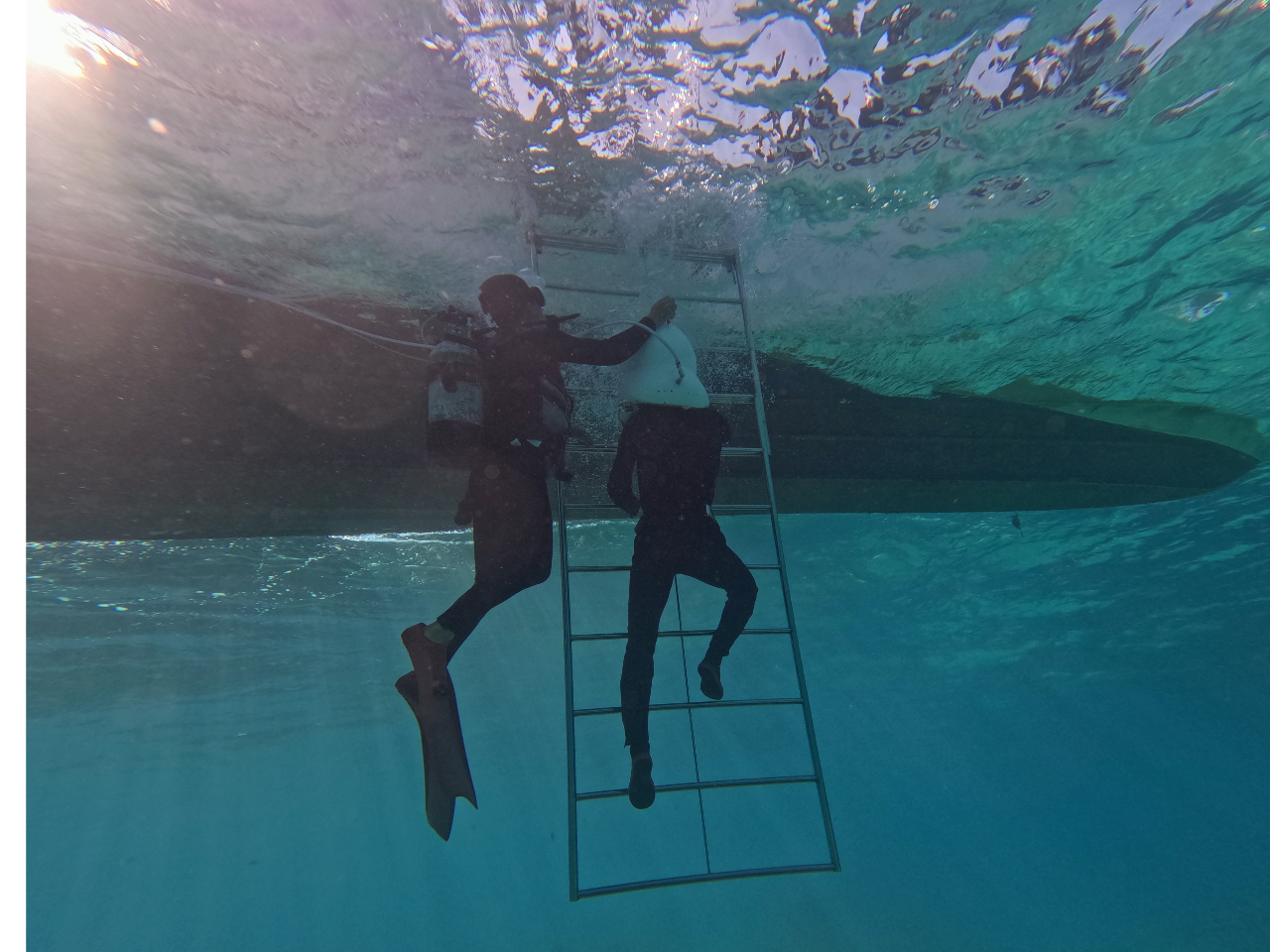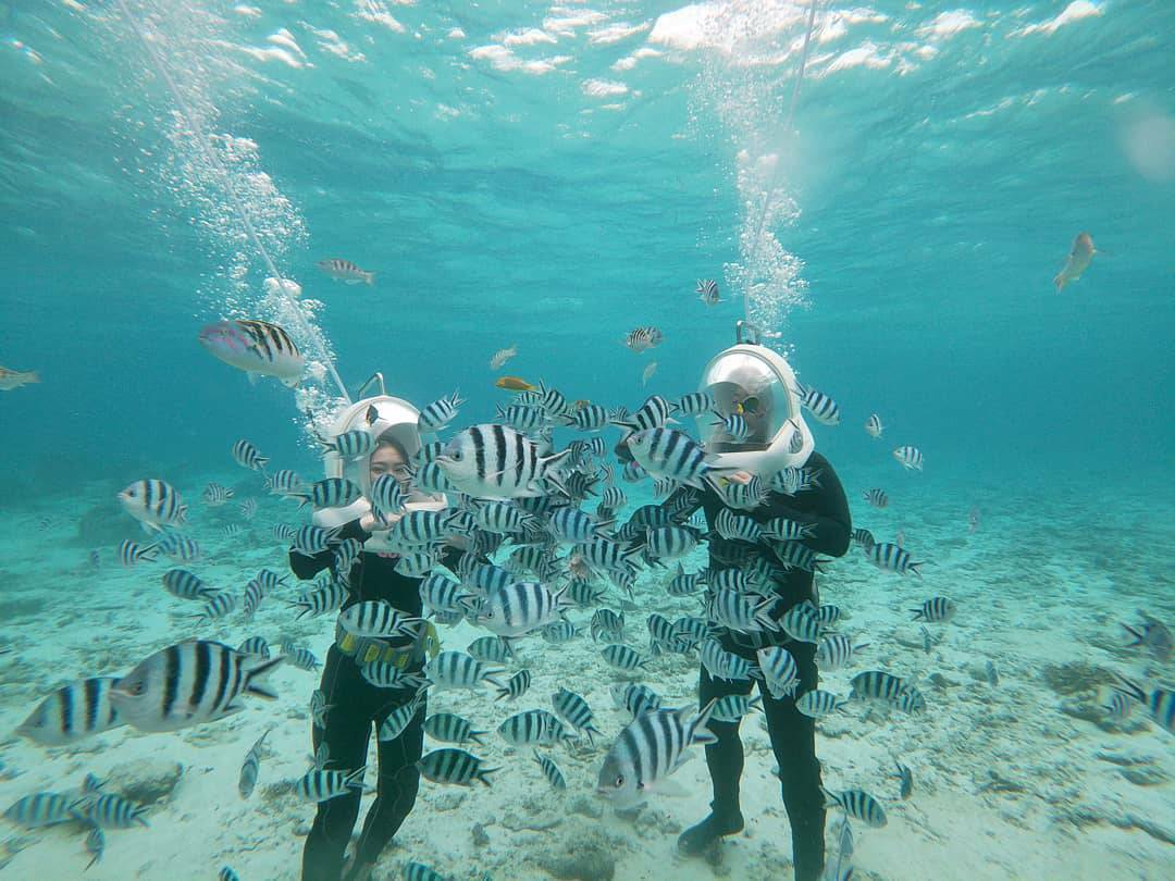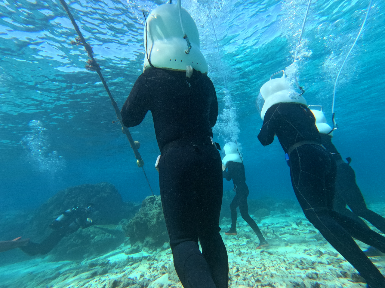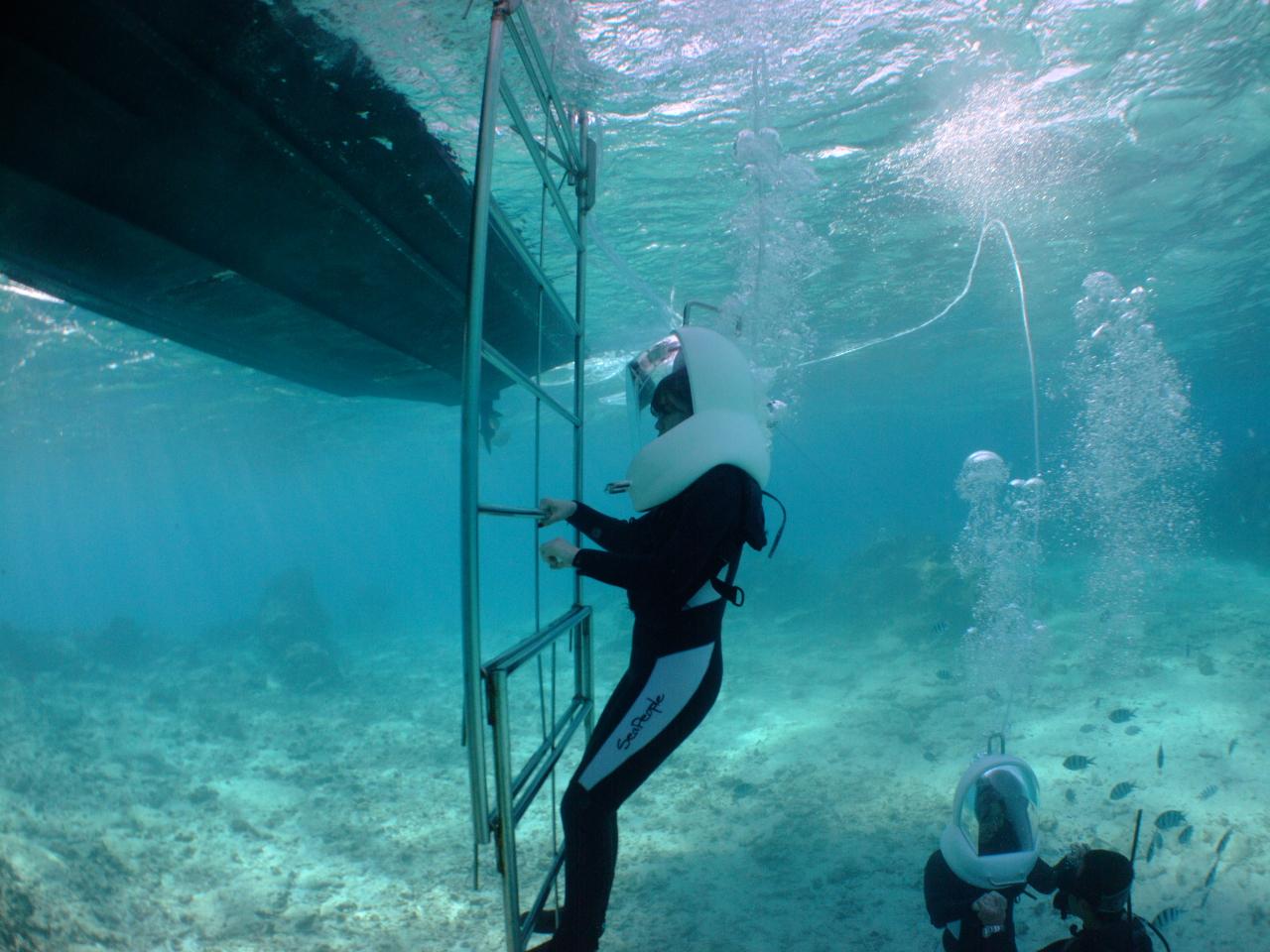 顔が濡れない、ヘルメットをかぶって水中を散歩できます