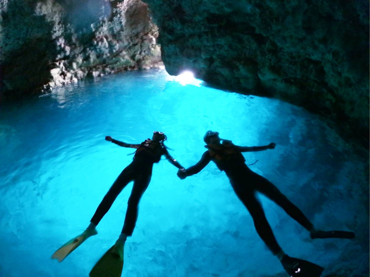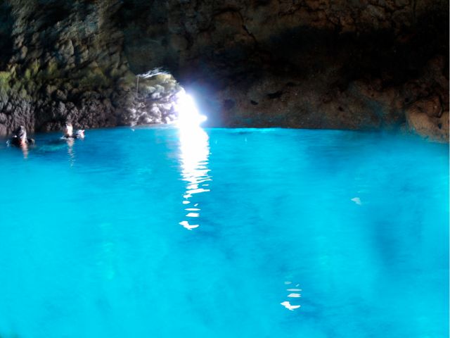 泳げない方でも、安心してご参加できるようにインストラクターが、浮輪に相当するビート版など引張りながら、青の洞窟へご案内致します。