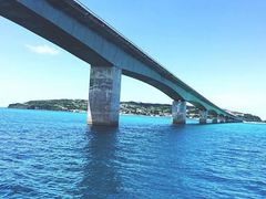 今帰仁から屋我地島に渡るワルミ大橋、ちょっとスリルある高さから、眼下に見える青い海峡?一見の価値あり。