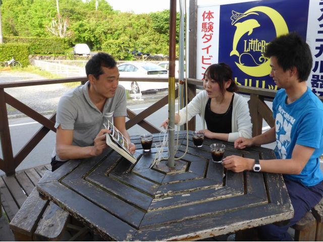 体験ダイビング後、皆様笑顔でランチタイム!今見てきた魚の話で盛り上がっています♪