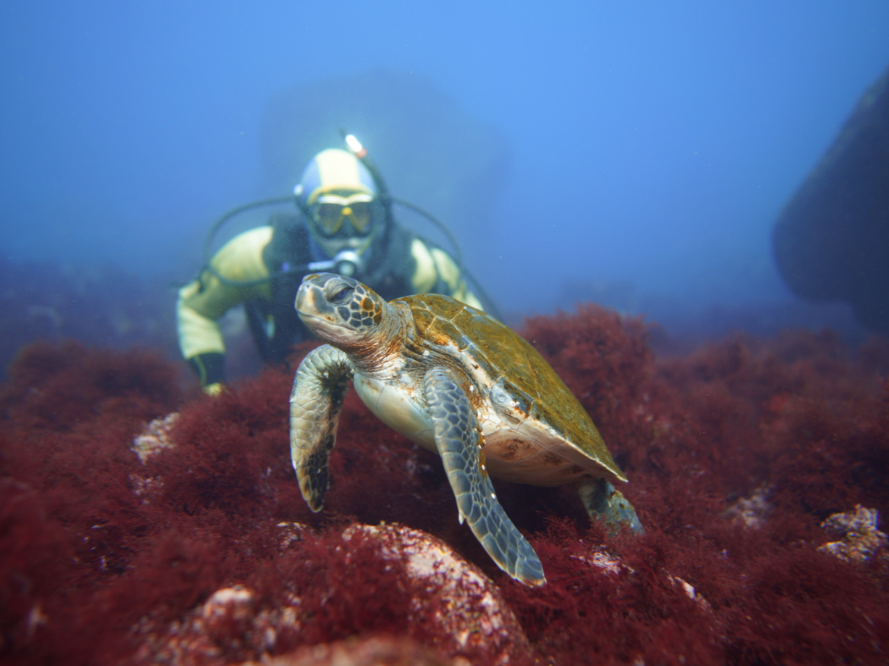 ダイビングライセンス講習中にカメにも会える海です!
