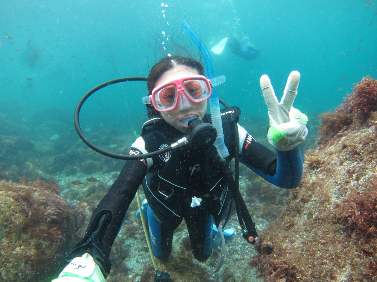 インストラクターと一緒に1本目は水深5〜6mくらいの水中をゆ〜っくり散歩します。(約30分前後)。休憩後、2本目は水深10mまでになります。同じく30分程度の水中散歩をお楽しみ下さい。