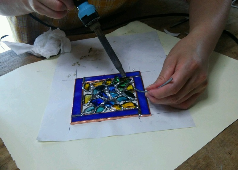 はんだごてを使って、ガラスと枠を接着します。