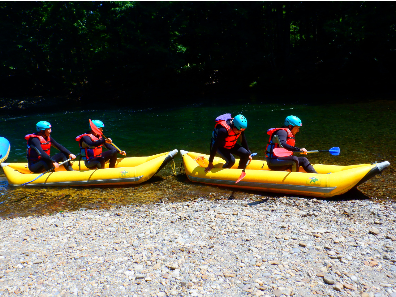 「自分でボートをコントロールしてみたい」そんなあなたの挑戦を、経験豊富なプロガイドがしっかりとサポートします。ツアー開始前には、安全に関する詳細なレクチャーとパドル操作の基本を丁寧にお伝えしますので、ダッキーが初めての方や、もしもの時にどうすれば良いか不安な方もご安心ください。万が一、沈(転覆)してしまっても、ガイドは、周りから皆さまのサポートをしますので安心して下さい。