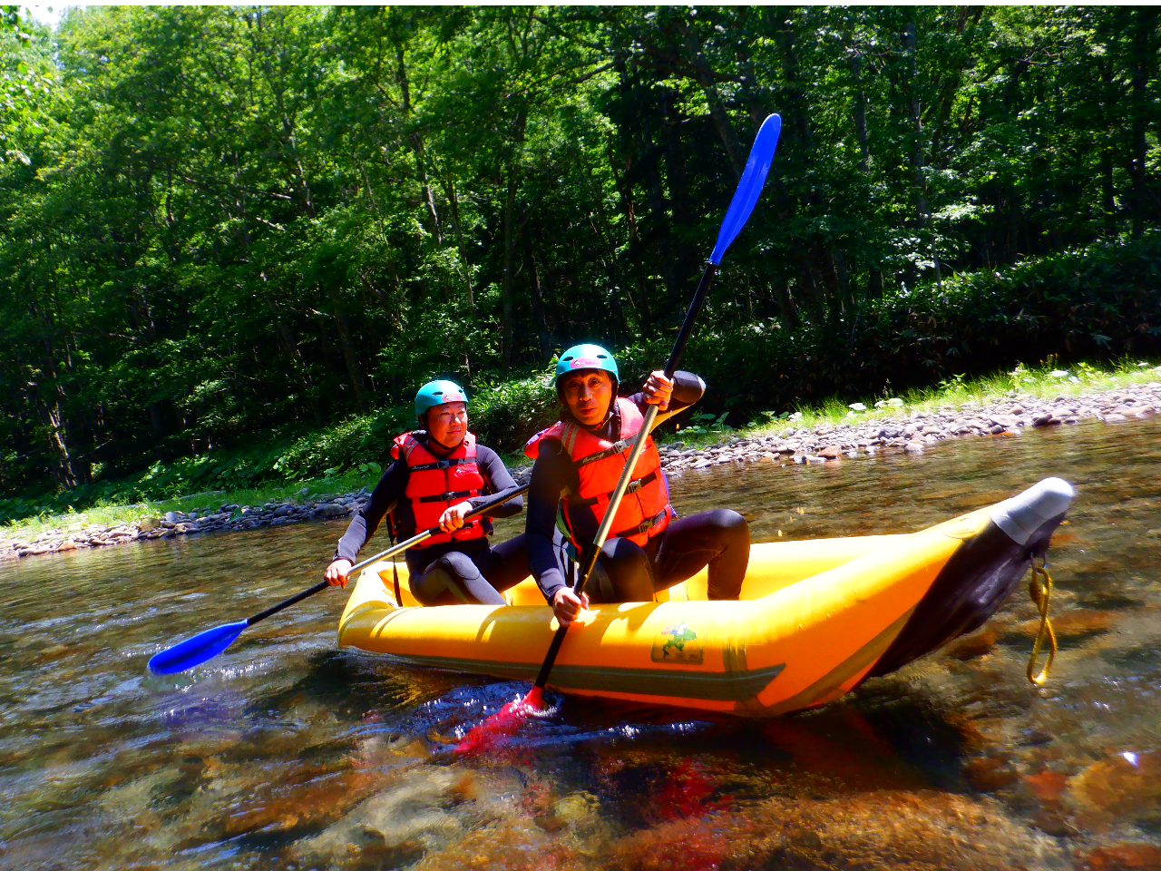 空知川の清流を舞台に、パドル一本で進む自由な操作性は、まさに川と一体になる感覚。時には激流を乗り越え、時には穏やかな流れに身を任せ、刻々と変わる川の表情を肌で感じてください。ラフティングでは味わえない、自分だけのラインを見つけ、川を読み解く面白さがここにあります。