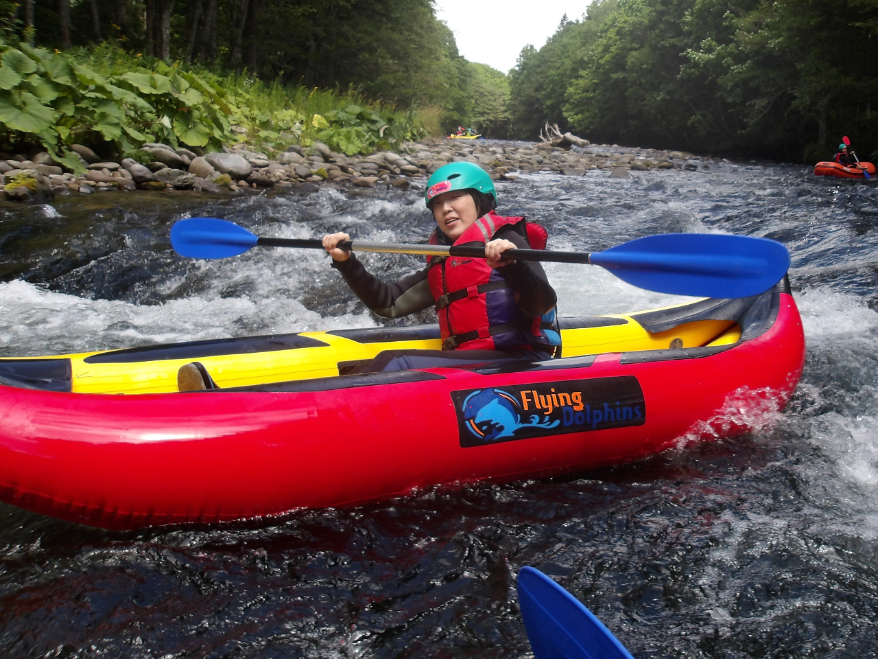 フライングドルフィンズが贈る「ダッキー」は、1〜2人乗りのインフレータブルカヤックで、よりダイレクトに川の流れを感じ、自分の力でボートを操る醍醐味を味わえるアクティビティです。