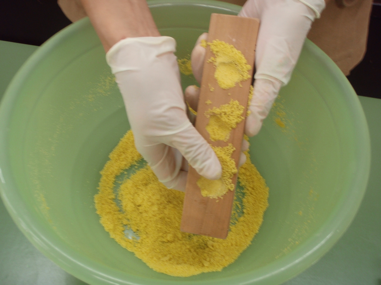 和三盆糖に水分を含ませ、よく練り、木型に入れて抜く。半生の和三盆は体験した人のみが味わえる至高の味。