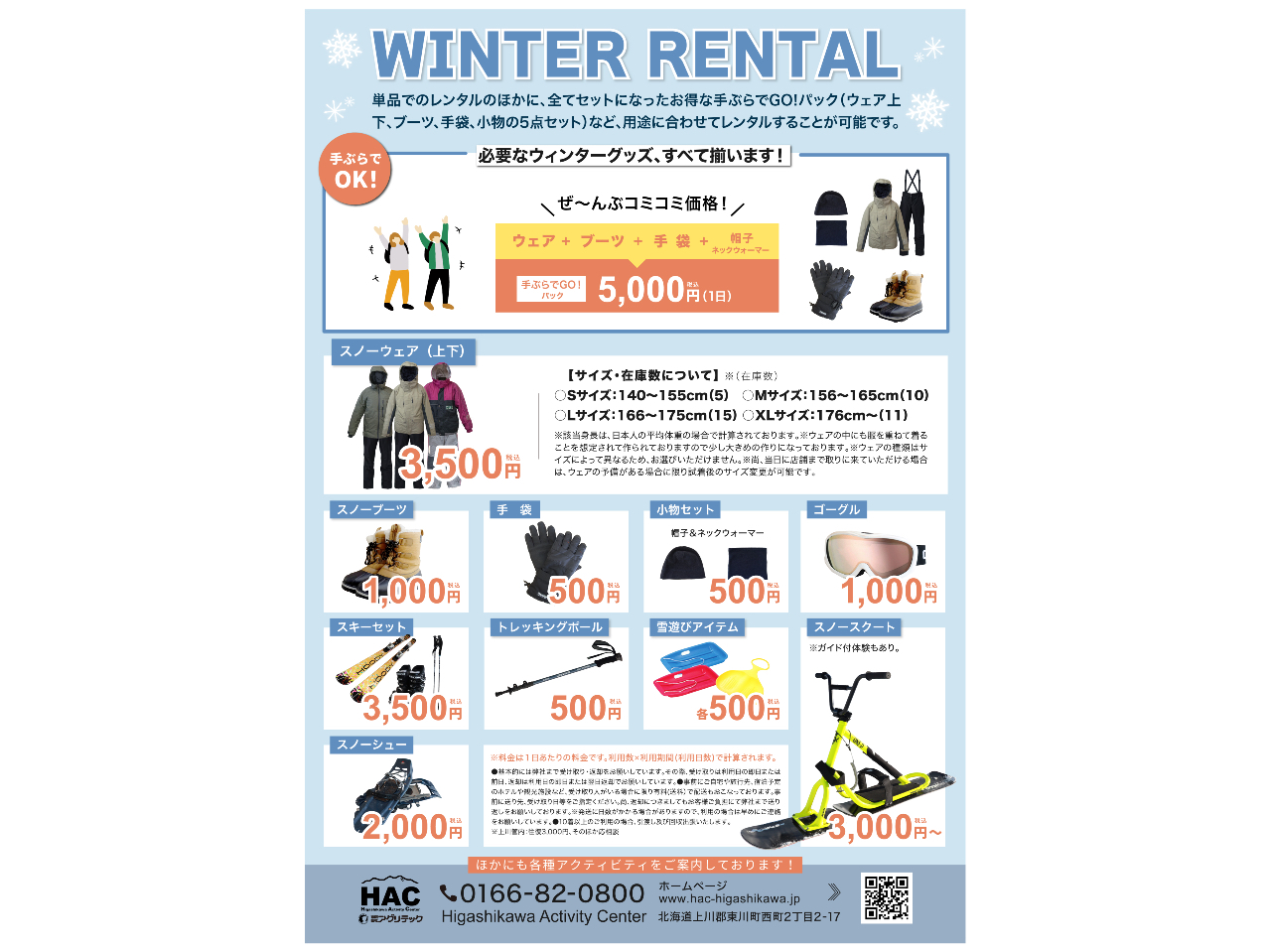 【レンタル】防寒ウェア&グッズ1日レンタル|冬の北海道満喫パック 手ぶらでラクラク!必要なウィンターグッズ、すべて揃います! その他雪・スノースポーツ 北海道上川郡東川町西町2丁目2-17 手ぶらでGO!パック 5,000円〜- ポイント2%