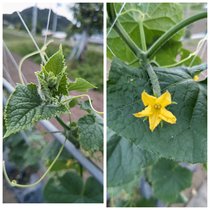 ツルがとっても芸術的で、カメラを向けていたら、なり始めのきゅうりを発見。農家では無いので、なかなか目にしない光景でした。