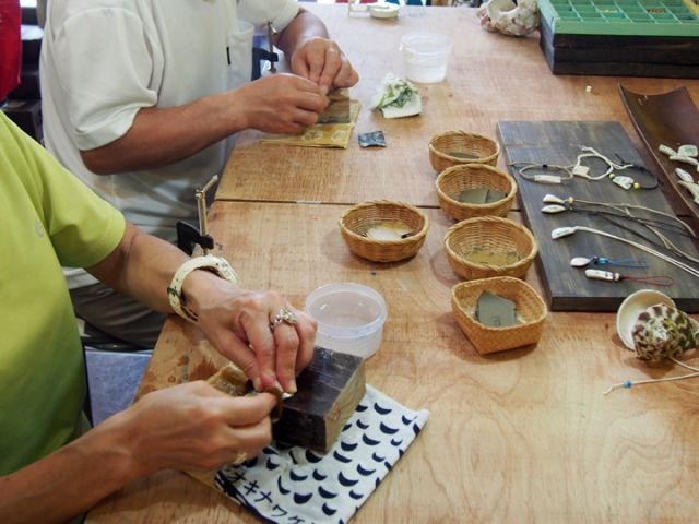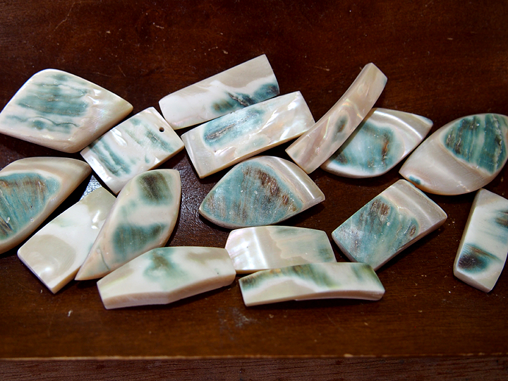 色んな形状のカット済み夜光貝から、お好きなパーツを選び丁寧に磨き上げます。
