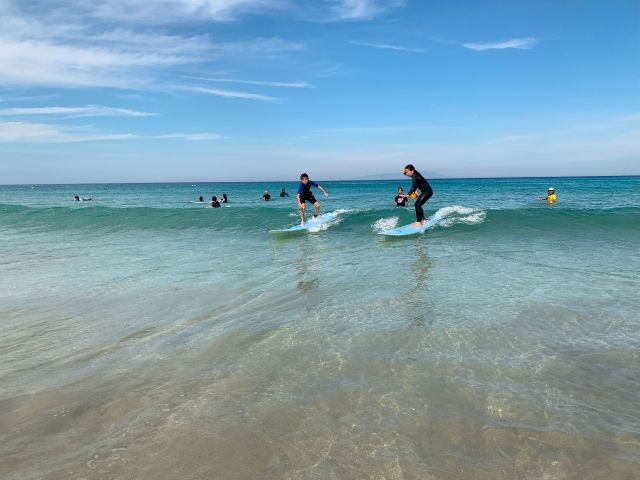 約1時間30分のレッスンで、基本、マナーの説明後、海でボードの上に立てるようにレッスンします。