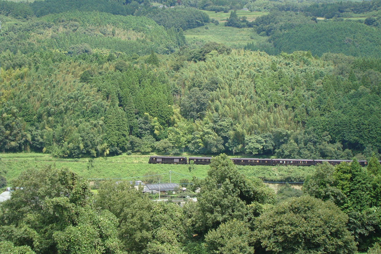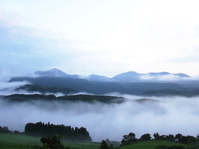 遠くまで連なる山々、山間に広がる田園風景の広がる