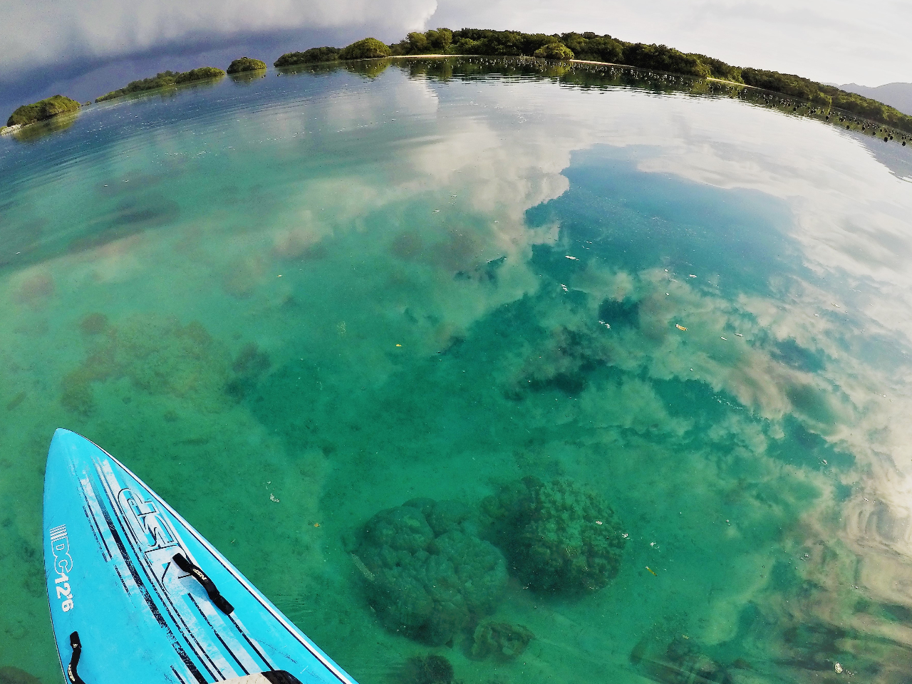 サンゴのお花畑をクリアーSUP(そこが透明なので水中がのぞける)で体験してみよう