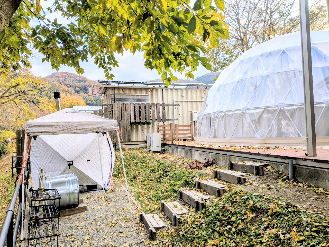 秩父 長瀞 Morethan Paradiseグランピング施設の1棟貸切で、プライベートなサウナとドームテントで休憩を楽しむプランとなります。シャワートイレが各棟に設置があり完全にプライベートで楽しんで頂けます。