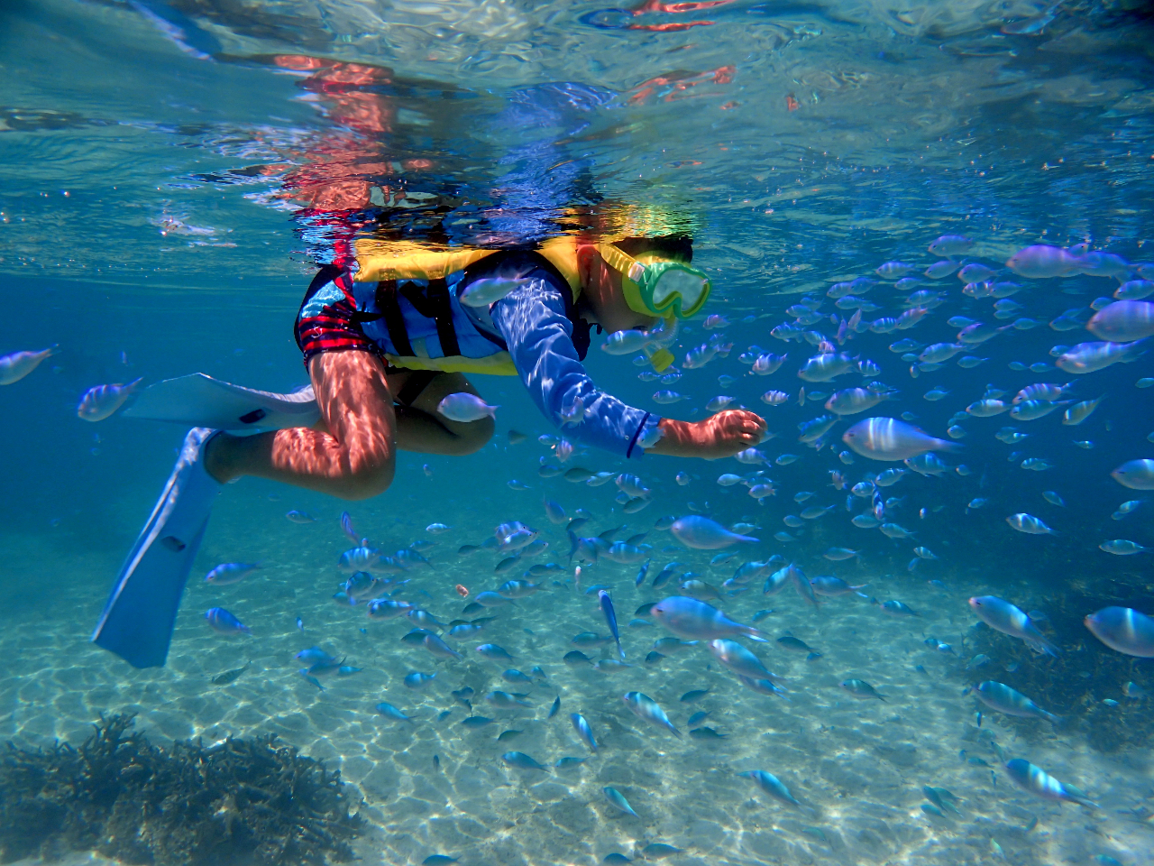 幻の島シュノーケリングではカラフルサンゴやたくさんの魚達をお出迎え。初めての方でも丁寧に講習しますのでご安心ください。