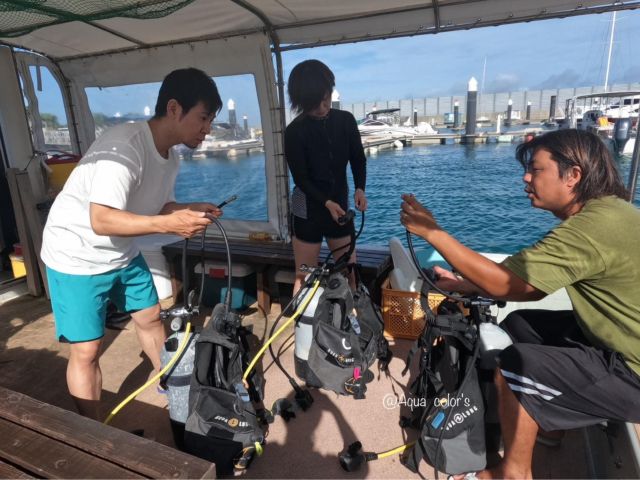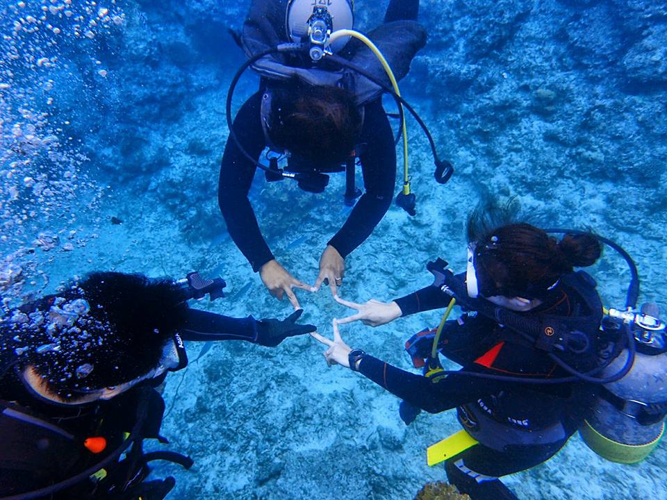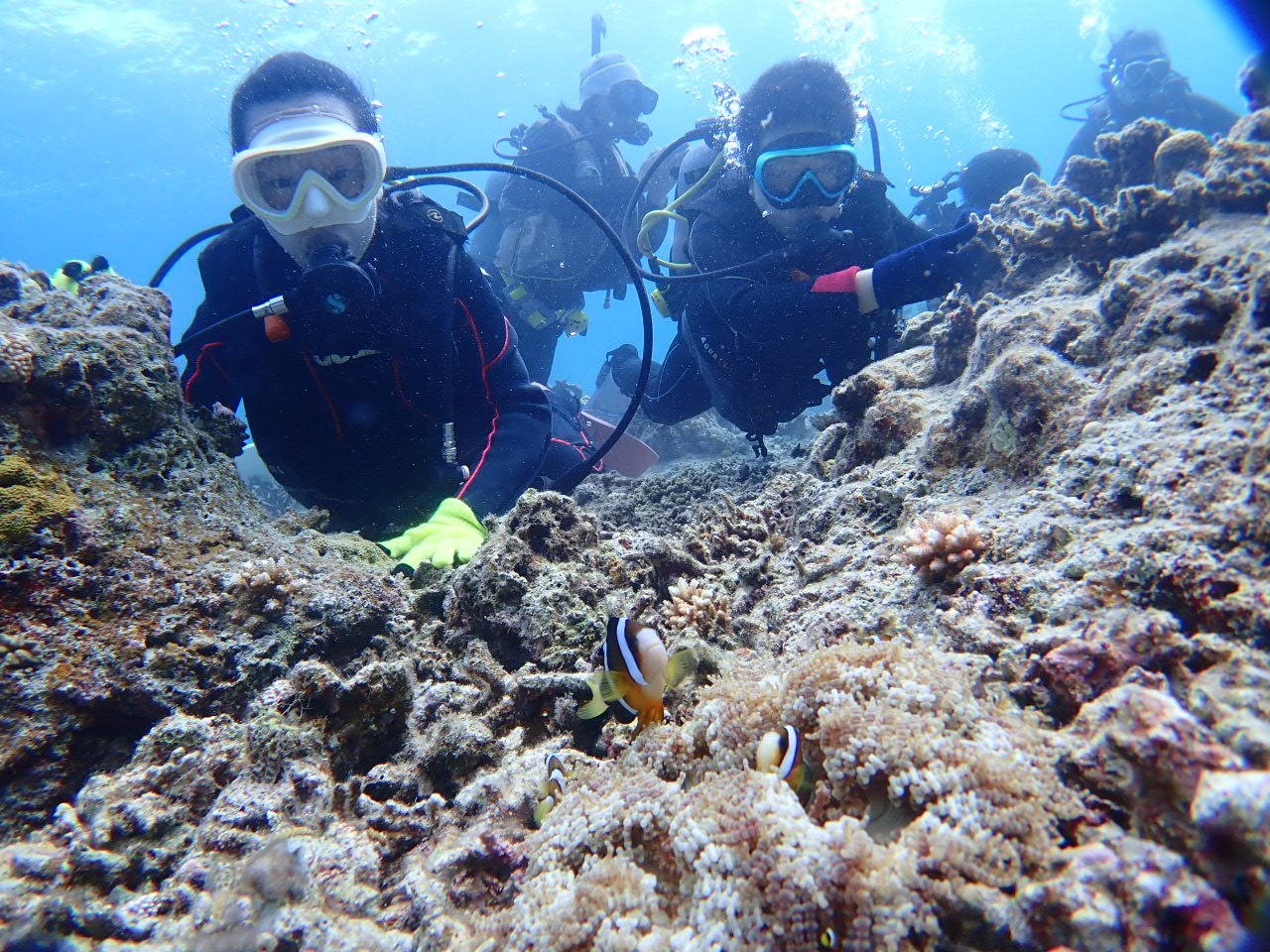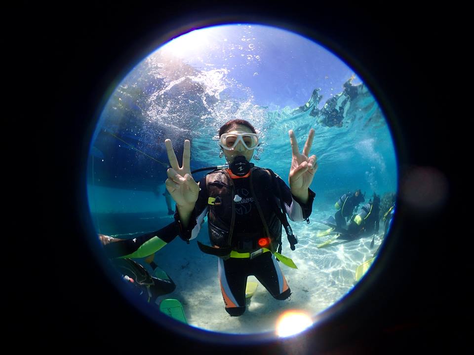 その後、ダイビングで使う器材の使い方や水中での過ごし方、ハンドシグナルなどの講習後、体験ダイビングを