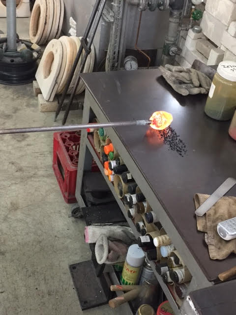 1100度で溶けているガラスに、鉄の吹き竿で、まきとって作る吹きガラス。