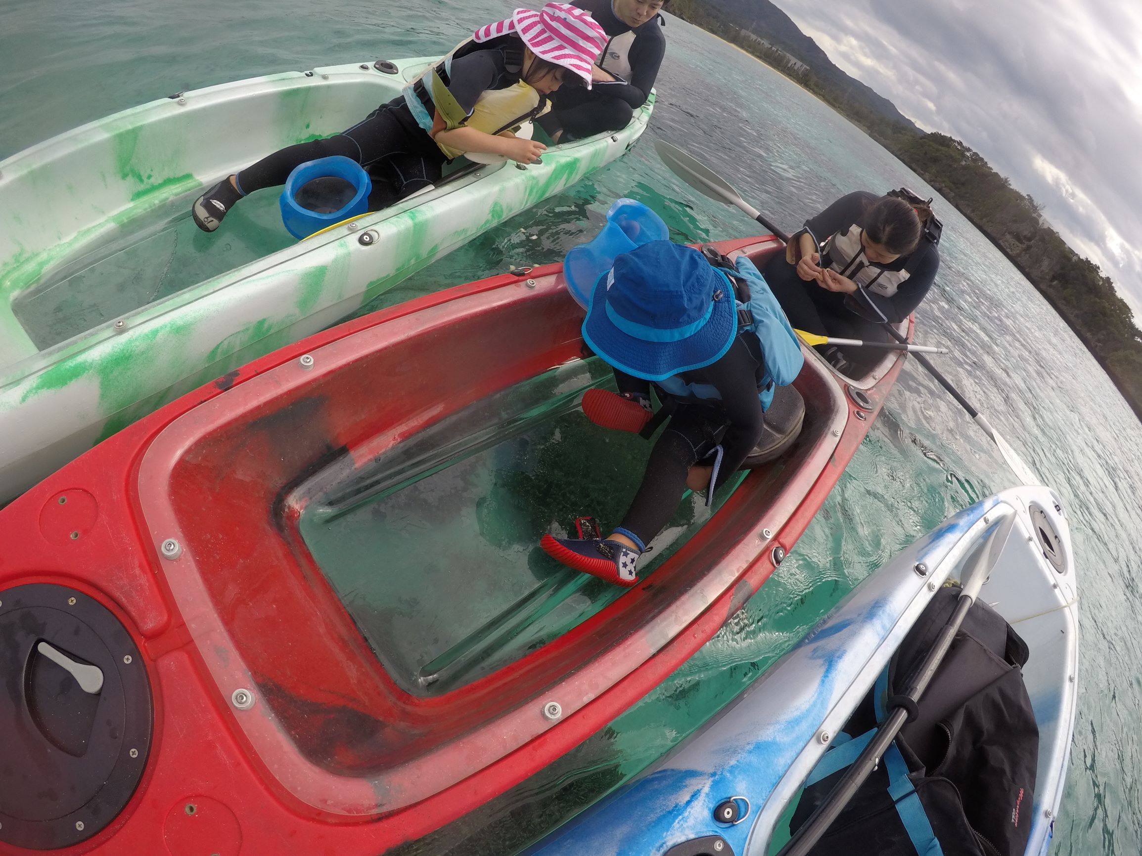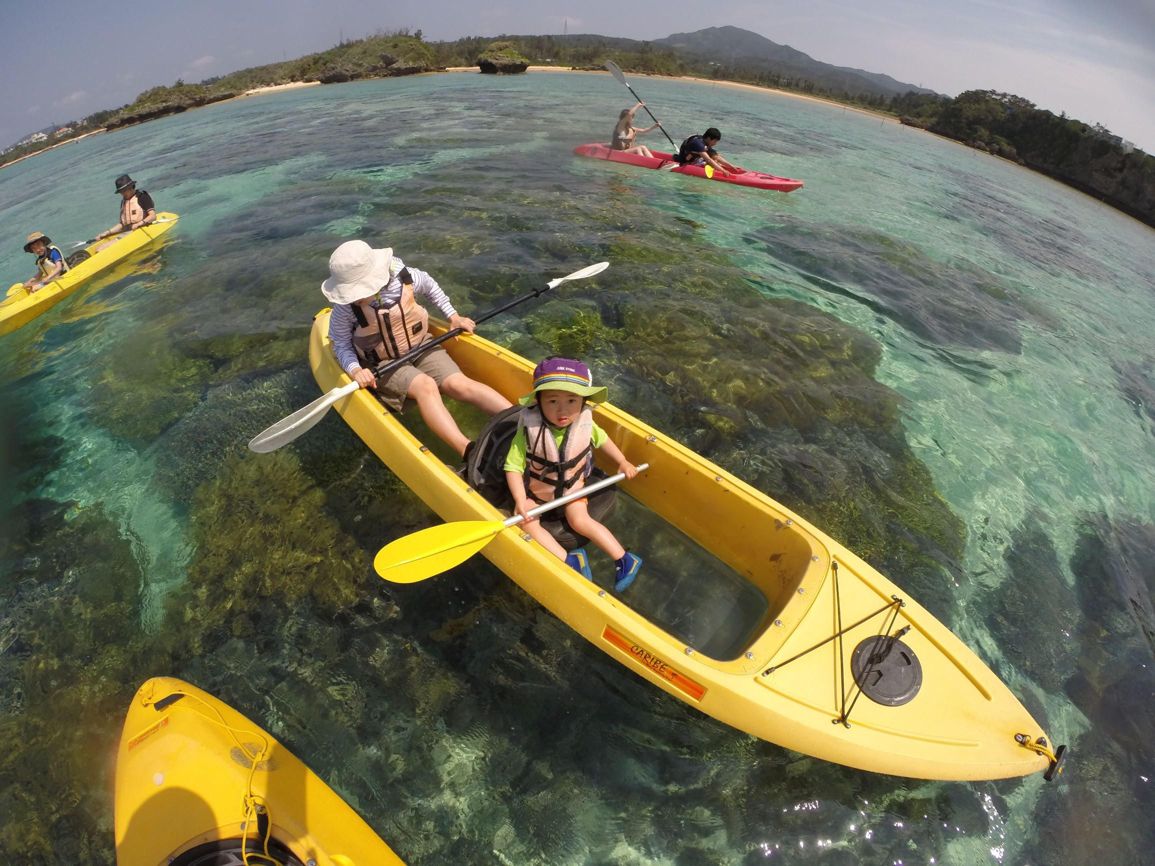 シーカヤックツアーには全てクリアカヤックを使用しています。船底がクリアタイプなので、色とりどりの熱帯魚・美しい珊瑚やイソギンチャクの森に群れるお魚たちを見ながら進めます♪♪また、底が平らなので安定性が高く、3歳のお子様から安心して参加することが出来るのでファミリーでの海遊びにもおすすめです。