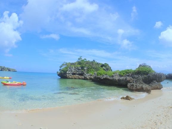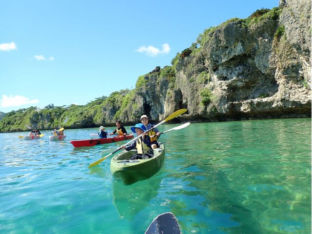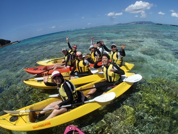 底が透明なカヤックに乗って白い砂浜が広がるやどかり島に上陸したり、琉球石灰岩の洞窟を歩いて散策、色とりどりの珊瑚やカラフルな魚たちがいる海の中を楽しみながら行くシーカヤックツアー。
