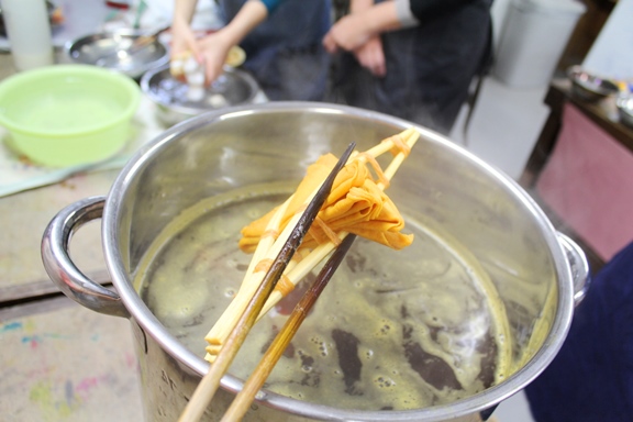 輪ゴムなどを使って布を絞り、化学染料で好きな色に染めます。
