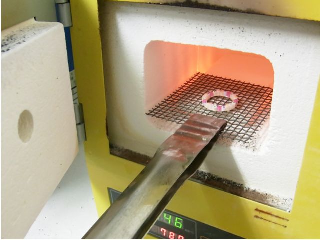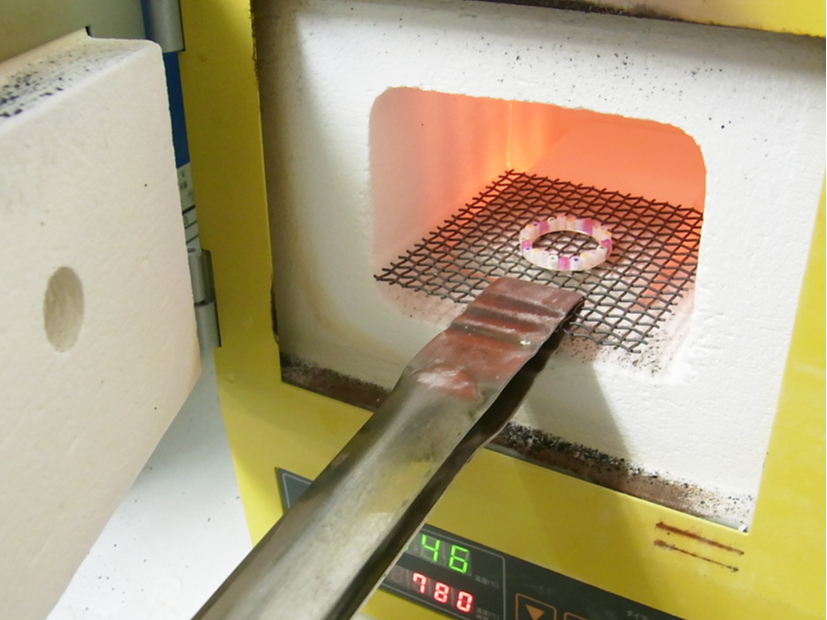 C きれいにミルフィオリが並んだら、約800℃の電気炉で焼成します